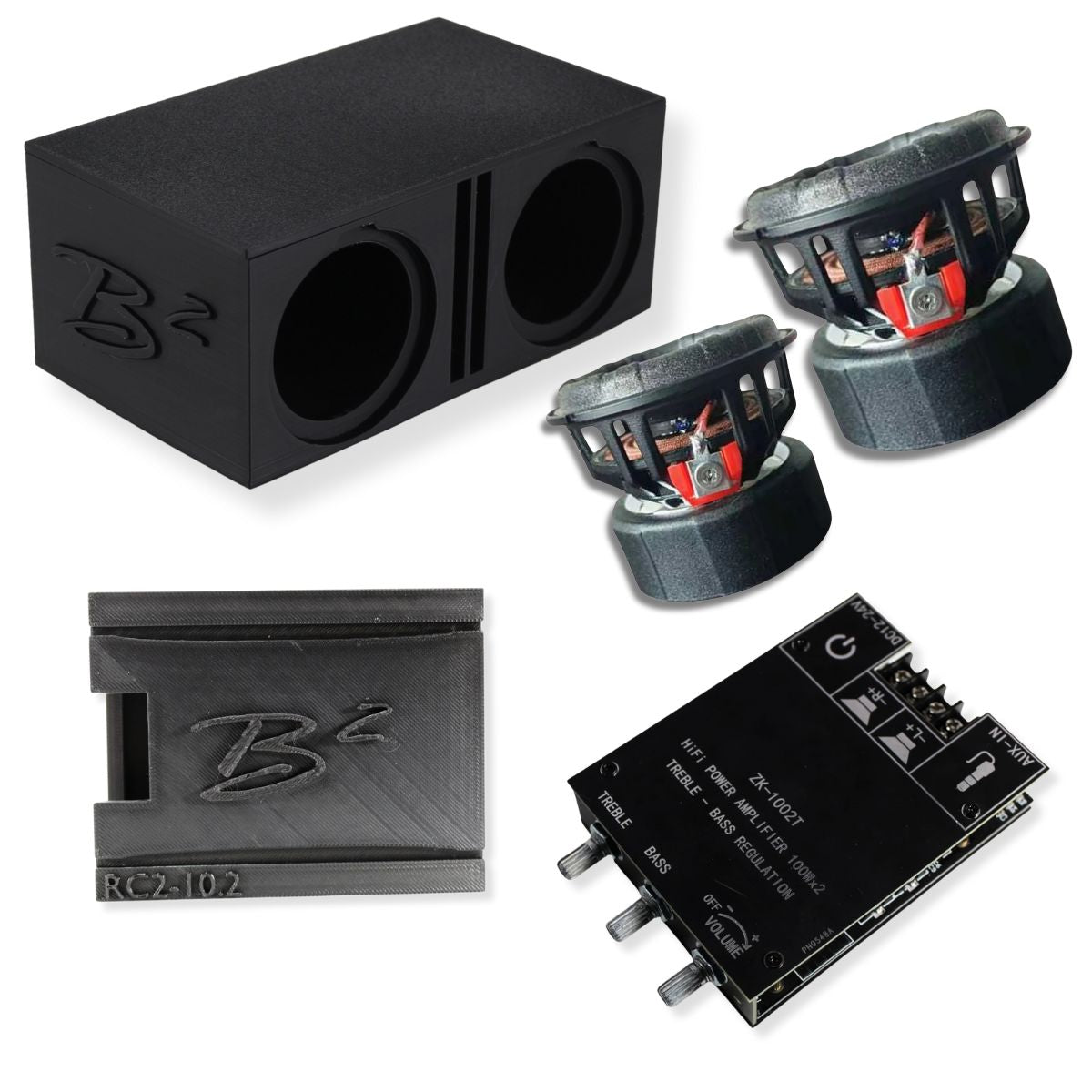 Each 2.5" RIOT-2.5 woofer features a lightweight paper cone, aluminum basket, and 4-layer aluminum voice coil for accurate midbass and tight, detailed response. The dual-ported 3D-printed subwoofer enclosure enhances airflow, cooling, and bass output while maintaining a compact form factor. The Daakro ZK-1002T amplifier provides efficient power delivery, mounted securely inside a custom 3D-printed B2 Audio amp enclosure built for strength, ventilation, and professional presentation. Together, these components create a self-contained, premium-quality micro audio experience.